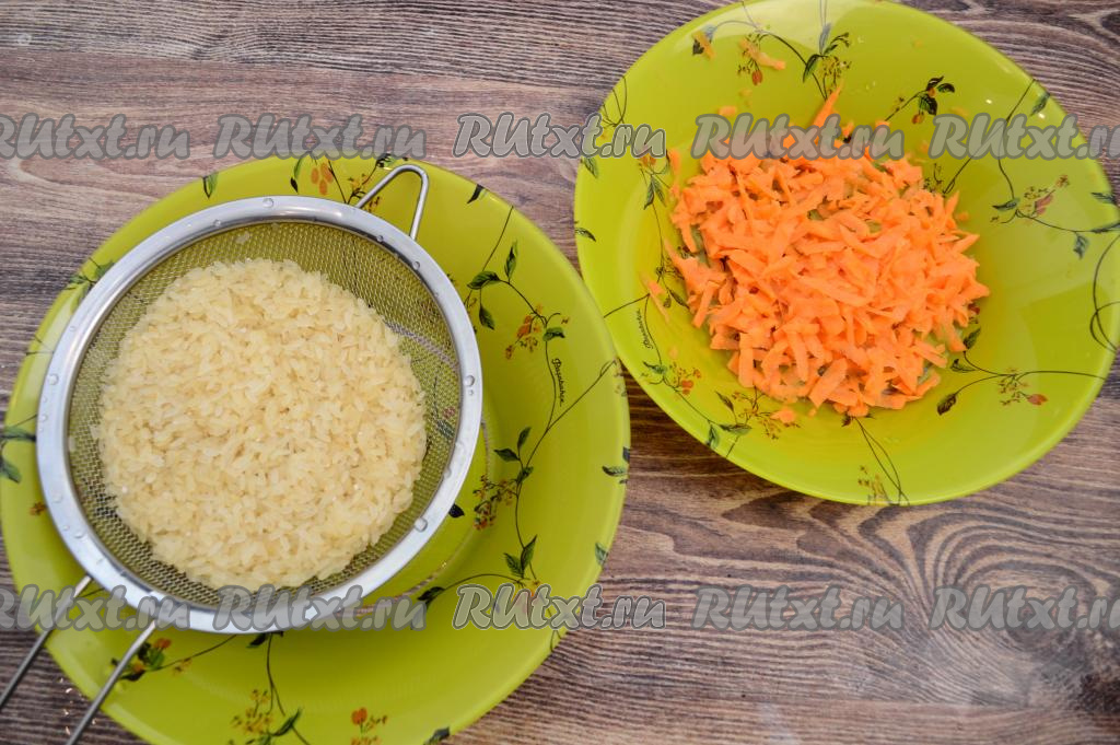 Рис выложить в сито, хорошо промыть под проточной водой, затем лишней воде дать стечь. Морковь очистить (вес очищенной моркови у меня был 80 грамм), натереть на крупной тёрке.