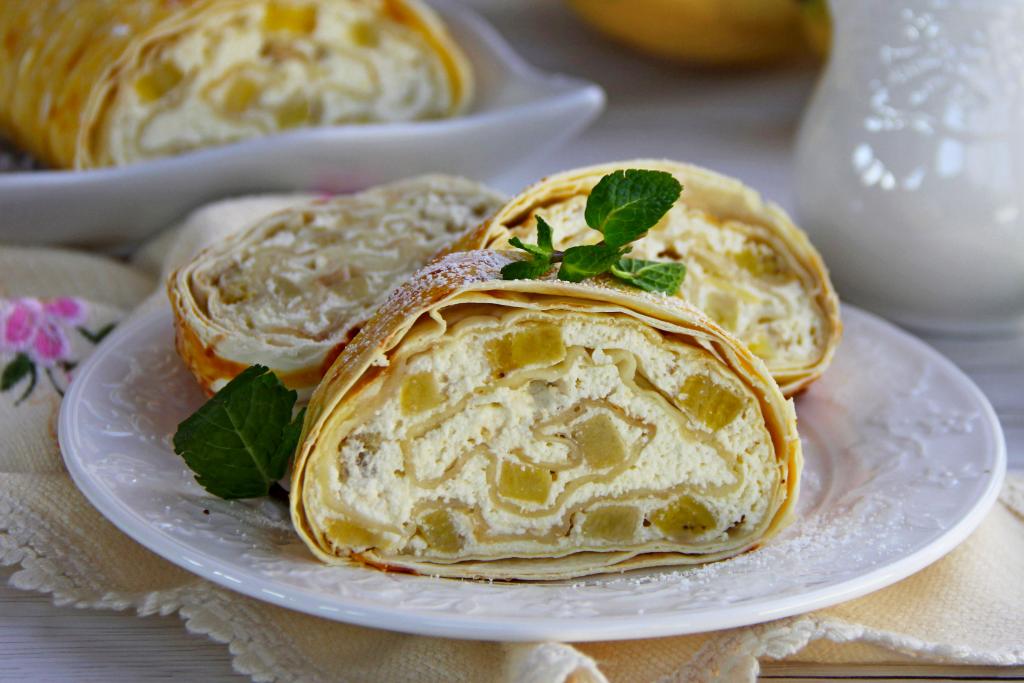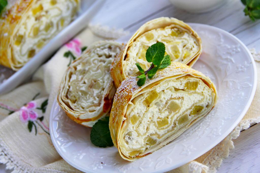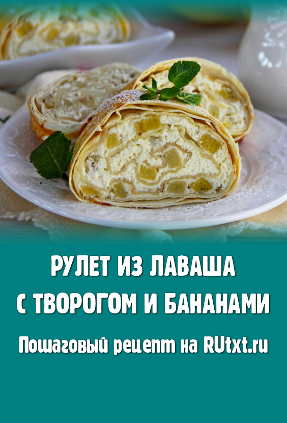 Нежный, очень вкусный, аппетитный рулет, приготовленный из лаваша с творогом и бананами, подать к столу.