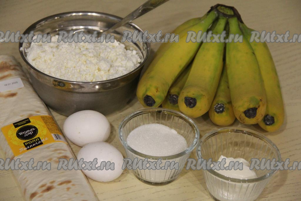 Поставить рулет с творогом и бананами в разогретую до 180 градусов духовку, выпекать минут 30 (до золотистого цвета лаваша).