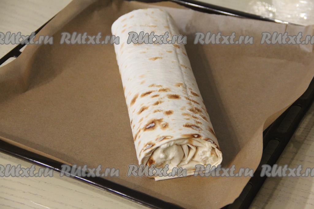 Немного подвернуть два длинных края лаваша на начинку. Затем свернуть лаваш в рулет, начиная с более узкой стороны.