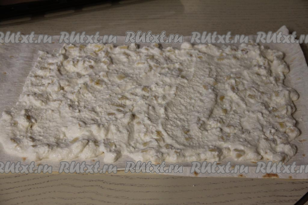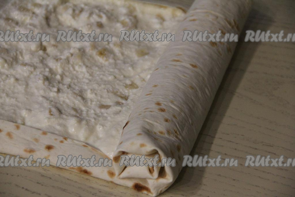 Лист лаваша смазать творожно-банановой начинкой, отступая от краёв лаваша. С двух узких краёв лаваша нужно оставить чуть больше чистого лаваша для того, чтобы удобно было формировать рулет.