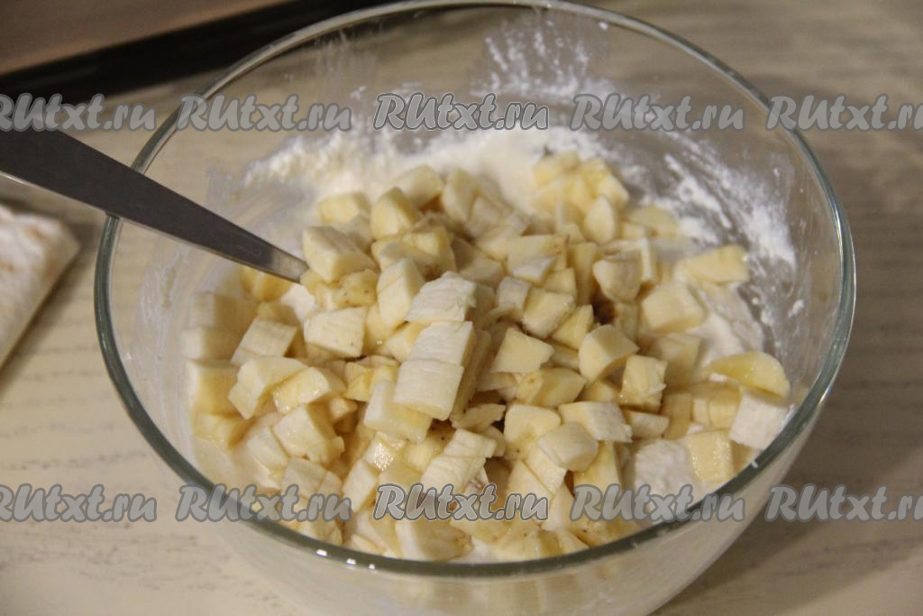 В миску с творожной начинкой добавить очищенные бананы, нарезанные на небольшие кубики, перемешать.