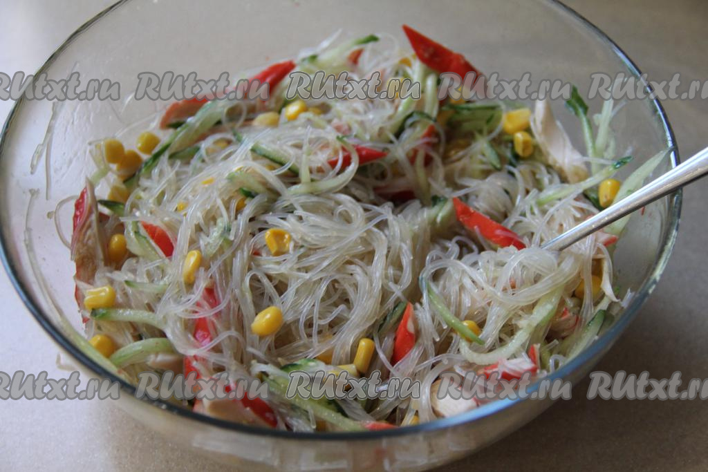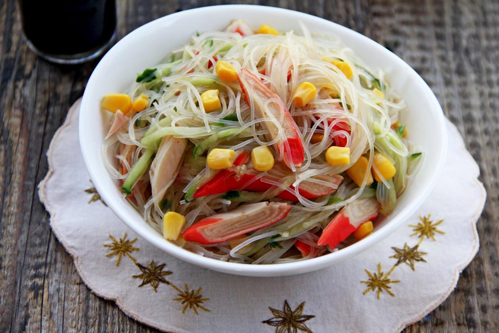Вкуснейший салат с фунчозой, огурцами и крабовыми палочками подать к столу.