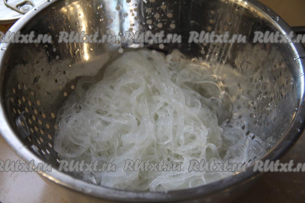 По прошествии 5 минут откинуть фунчозу на дуршлаг, промыть холодной водой, лишней воде дать стечь. Затем, если фунчоза длинная, нарезать её кухонными ножницами на части.
