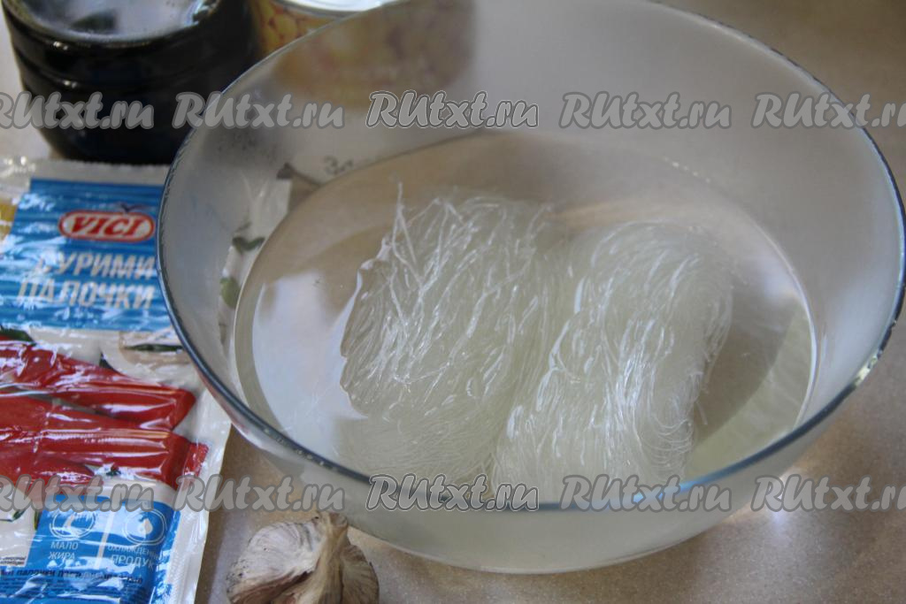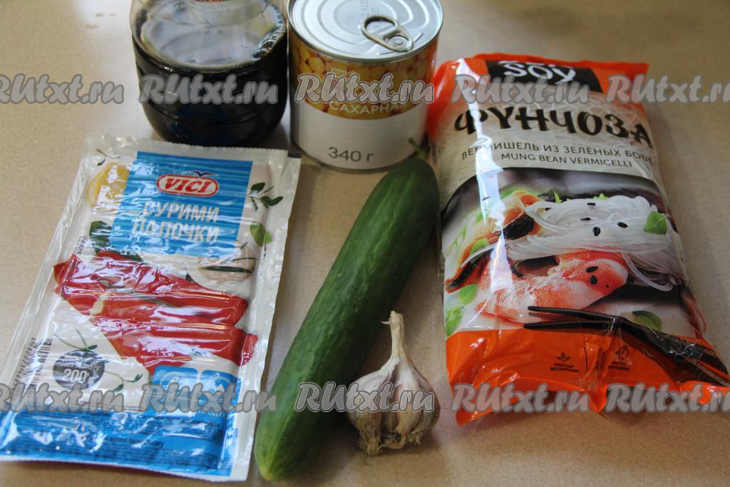 В миске соединить фунчозу, огурец и крабовые палочки, добавить чеснок, пропущенный через пресс.