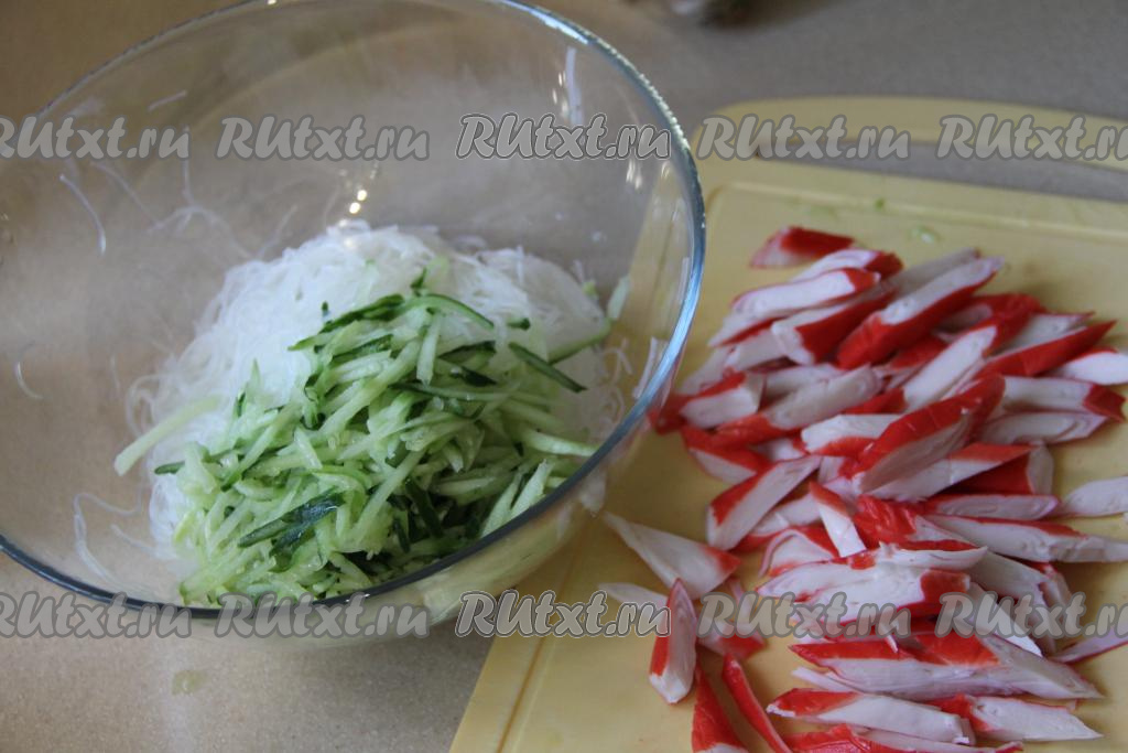 Пока заваривается фунчоза, натереть свежий огурец на тёрке для корейской моркови (или нарезать на тонкие брусочки). Крабовые палочки очистить от слюды и нарезать на длинные бруски.