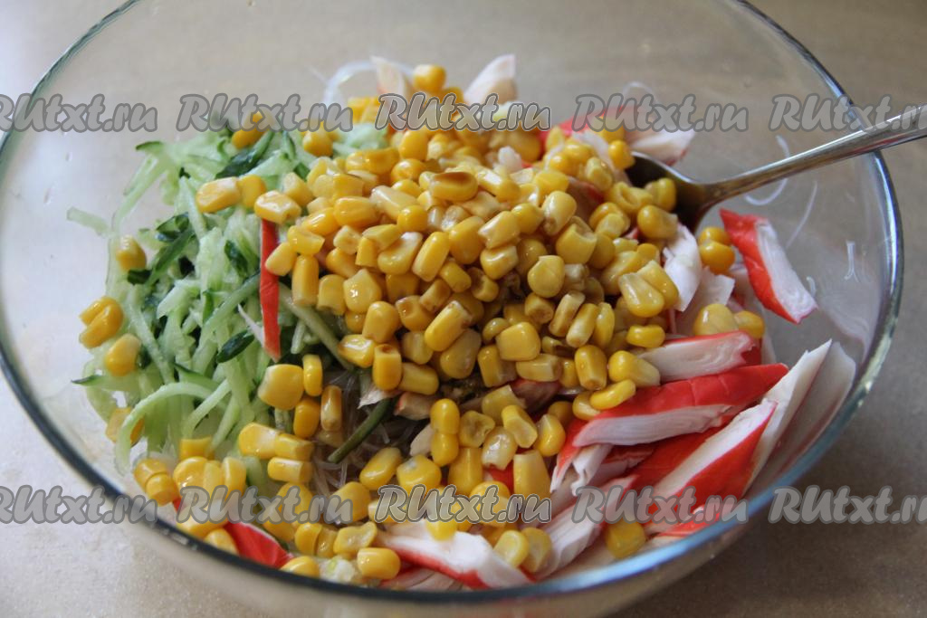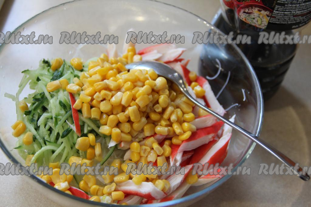 Затем выложить в миску с салатом консервированную кукурузу без жидкости.