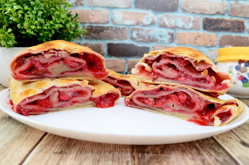 Слоёное тесто отлично подходит для приготовления различной выпечки с ягодами. В этот раз решила из покупного слоёного теста испечь рулет с клубникой. Готовится он проще простого, получается аппетитным снаружи и нежным, сочным внутри. Благодаря крахмалу, начинка из клубники в процессе выпечки слегка желируется, поэтому ягодный сок практически не вытекает во время выпечки. Уверена, этот яркий, очень вкусный слоёный рулет с клубникой понравится всей семье!