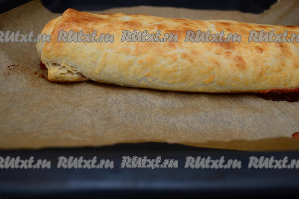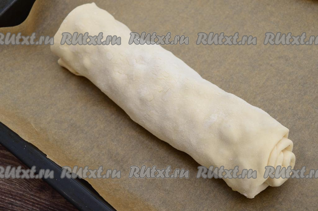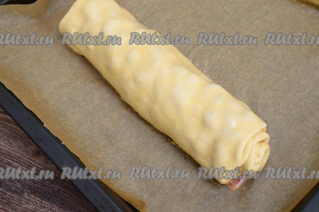 Сформированный рулет выложить на противень, застеленный пергаментом, так, чтобы шов теста был внизу.
