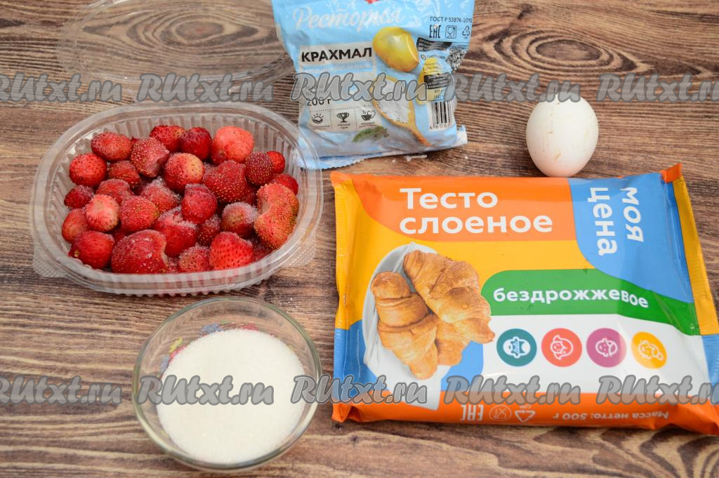 Подготовить продукты. Слоёное тесто заранее разморозить при комнатной температуре. Для выпечки этого рулета подойдёт как дрожжевое, так и бездрожжевое слоёное тесто. Клубнику можно взять как свежую, так и замороженную. Если у вас свежие ягоды, тогда их нужно очистить от чашелистиков, промыть и обсушить, выложив на бумажные полотенца. Замороженные ягоды, если на них нет большого количества льда, можно не размораживать.