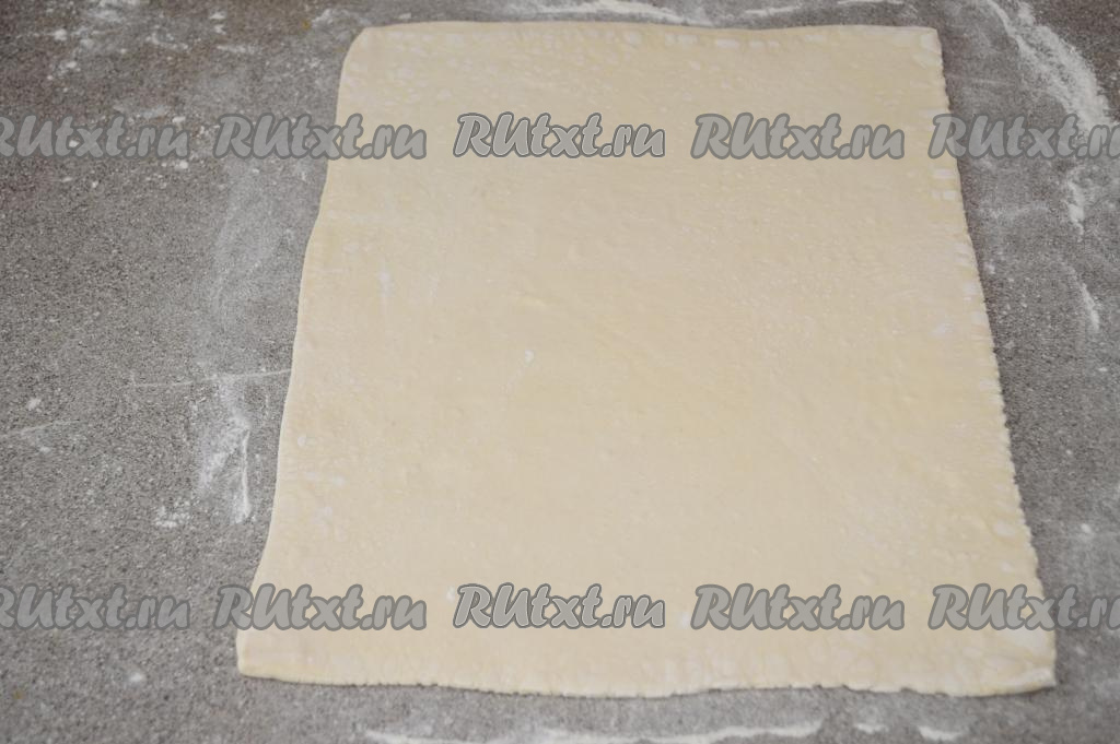 Пласт слоёного теста на припылённом мукой столе раскатать в прямоугольник.