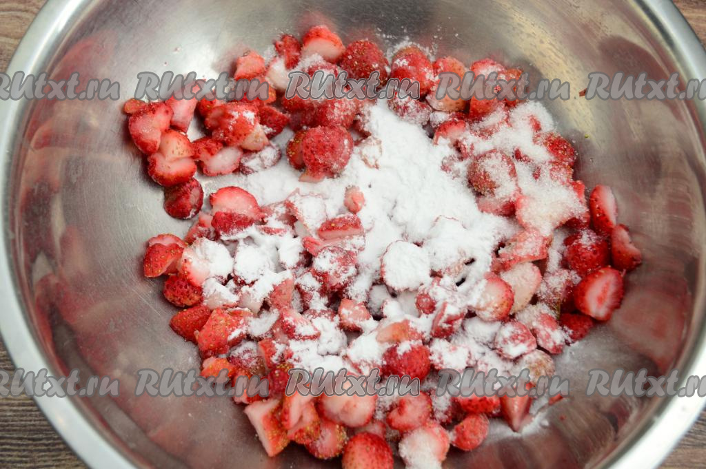 Перемешать сахар, крахмал и клубнику.