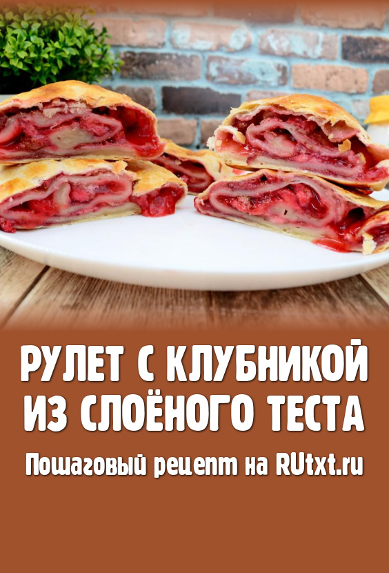 Выпекать рулет с клубникой в духовке, разогретой до 200 градусов, минут 30 (до подрумянивания слоёного теста).