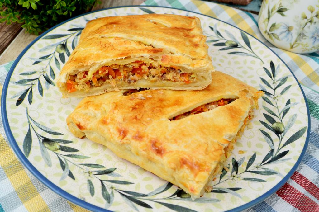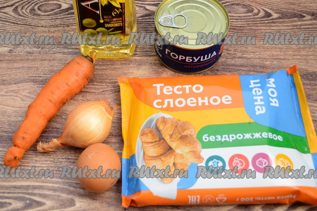 Из слоёного теста можно приготовить отличную и сладкую, и несладкую выпечку. В этот раз предлагаю испечь аппетитный, очень вкусный пирог из слоёного теста с начинкой из консервированной горбуши и морковки, обжаренной с луком. Даже в консервированном виде горбуша - достаточно сухая рыба, но благодаря тому, что к ней добавляются жареные овощи, начинка получается в меру сочной, насыщенной. К столу этот пирог можно подавать и тёплым, и полностью охлаждённым. Всем любителям рыбных пирогов советую попробовать эту выпечку!