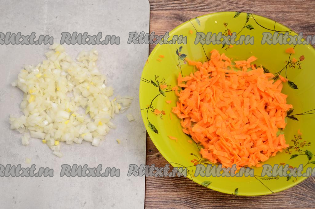 Прежде всего приготовим начинку для рыбного пирога. Для этого очищенную морковку нужно натереть на крупной тёрке, очищенную луковицу мелко нарезать.