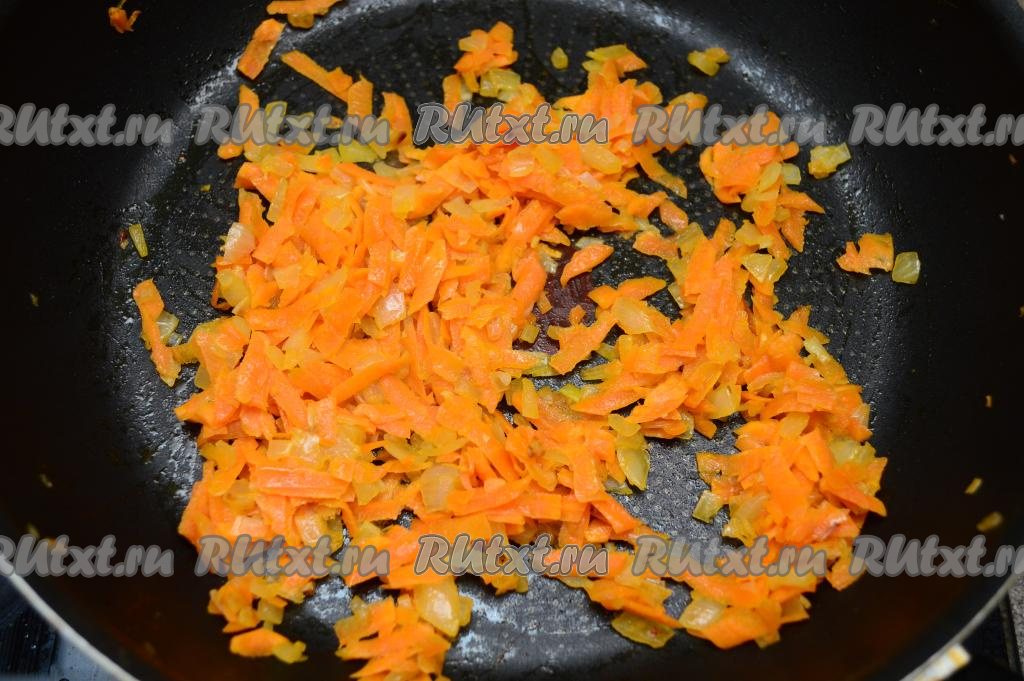Затем выложить в сковороду морковь, перемешать овощи, обжарить в течение 5 минут (до мягкости морковки). Обжаренные овощи убрать с огня, дать им остыть.