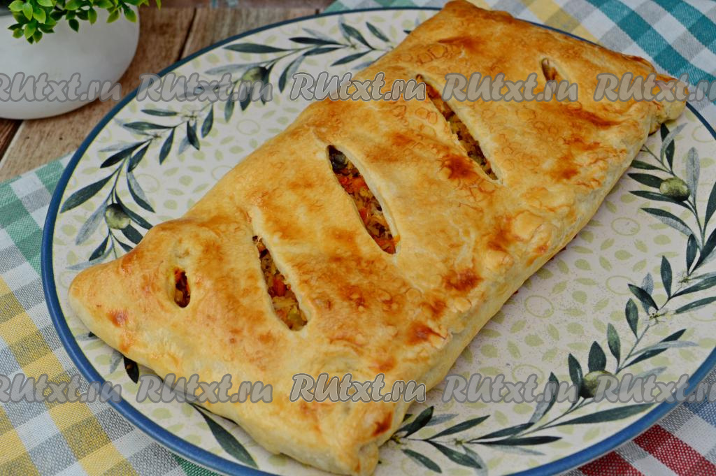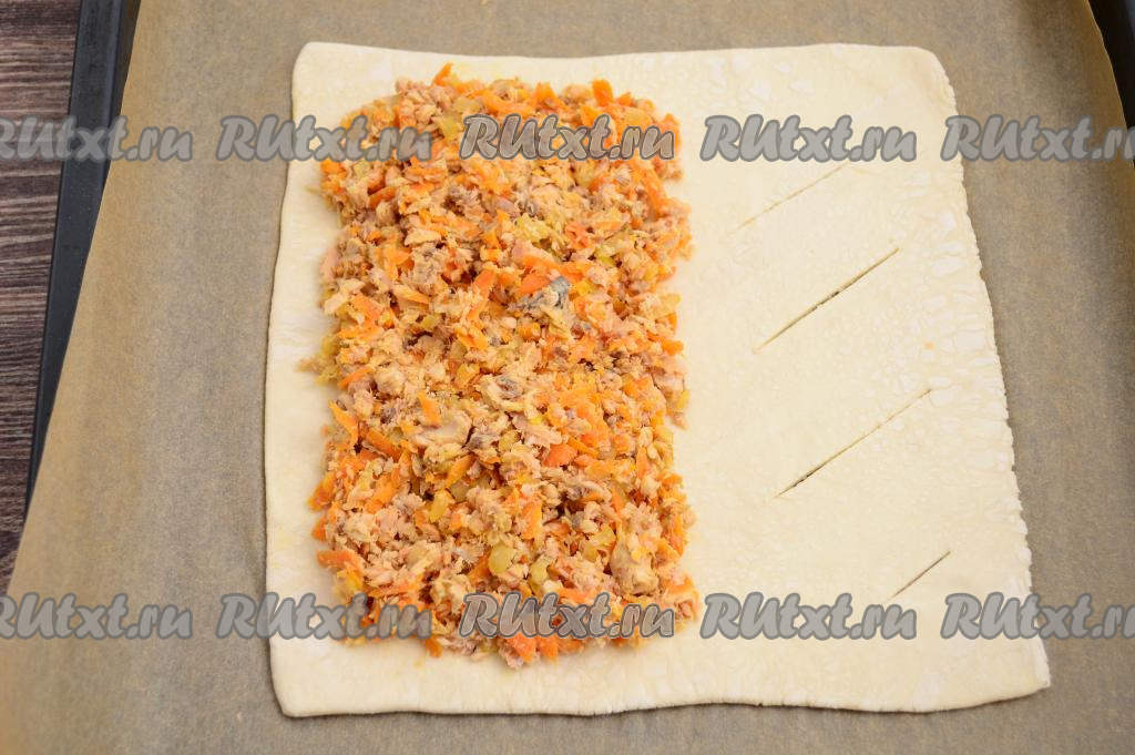 На сторону слоёного теста без надрезов выложить подготовленную начинку из горбуши и овощей, отступая от краёв теста примерно по 1,5 сантиметра.