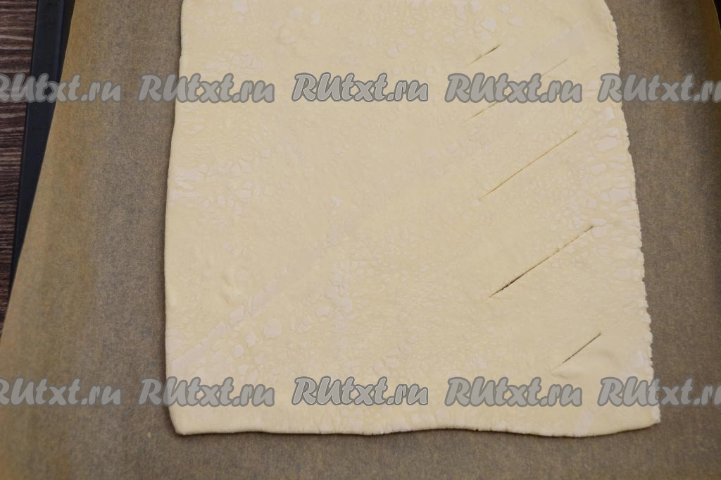 На присыпанной мукой поверхности размороженное слоёное тесто раскатать в квадратный пласт размером 25 сантиметров на 25 сантиметров, толщиной 2,5-3 миллиметра. С одной стороны теста сделать надрезы, отступая от краёв по 1-1,5 сантиметров. Перенести раскатанный пласт на противень, застеленный пергаментом.
