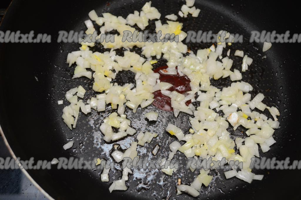Хорошо прогреть растительное масло в сковороде, выложить лук и обжарить его на среднем огне в течение 3 минут (до прозрачности), достаточно часто перемешивая.