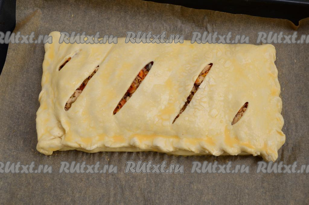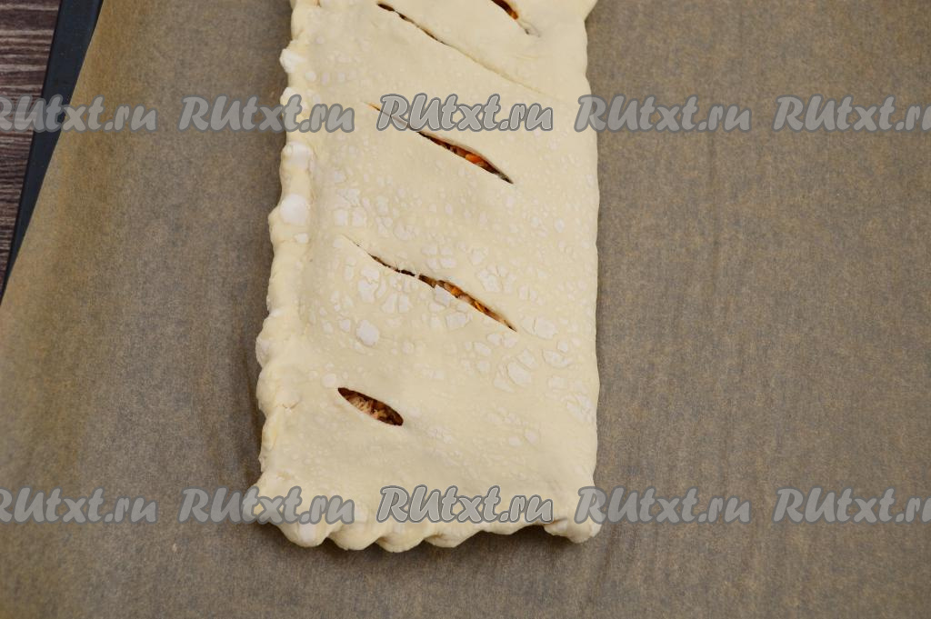 Накрыть начинку стороной теста с надрезами и сформировать прямоугольный пирог, хорошо скрепив концы теста руками.