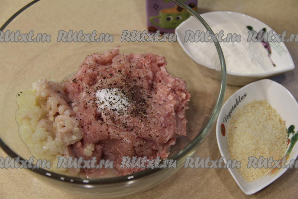 Лук и чеснок пропустить через мясорубку в миску с фаршем, добавить соль и чёрный молотый перец.