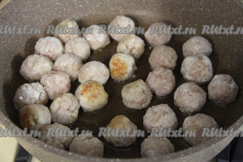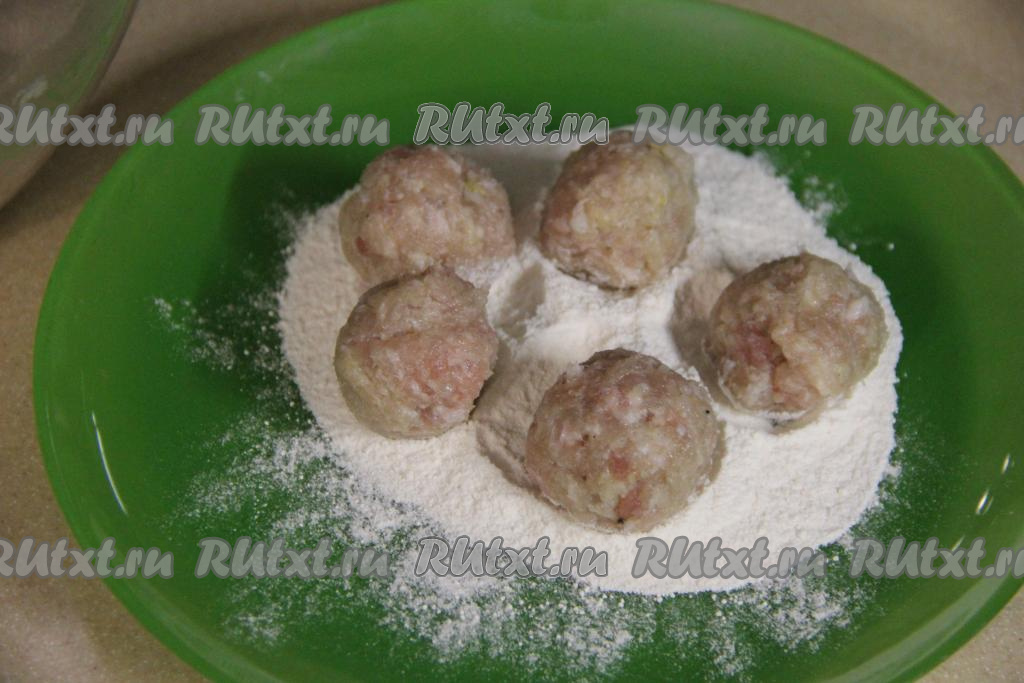 Сформировать фрикадельки размером с грецкий орех. Обвалять фрикадельки в муке со всех сторон.
