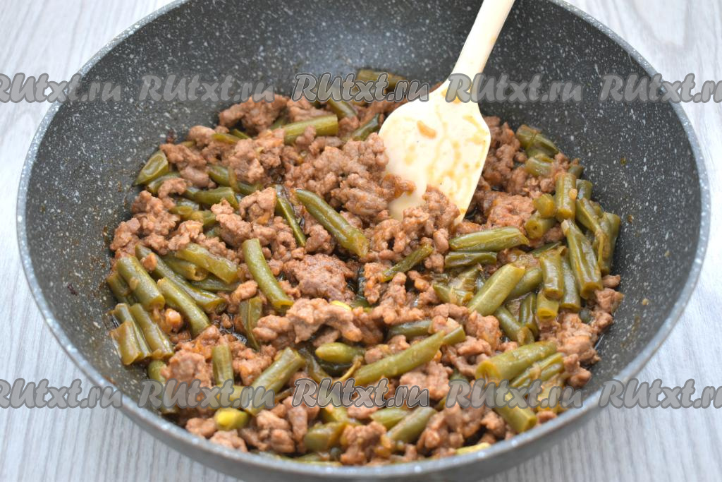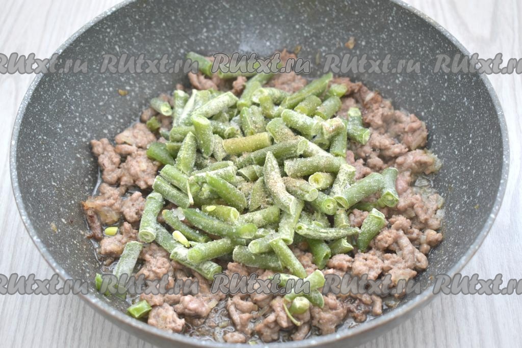 К обжаренному фаршу добавляем подготовленную стручковую фасоль, солим, перчим, перемешиваем.