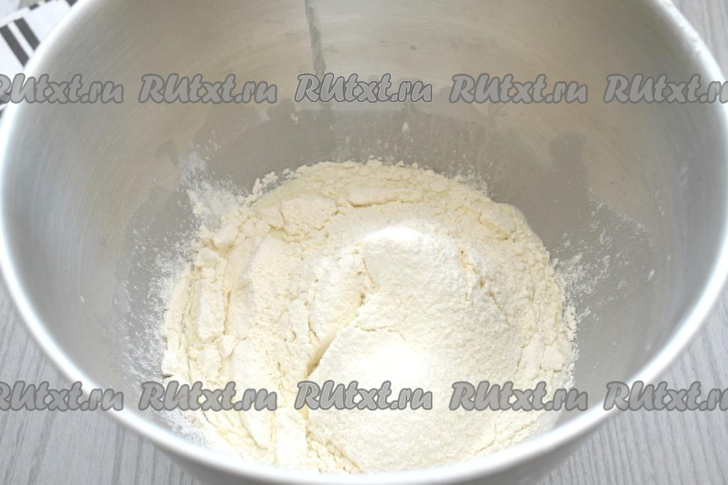 В получившуюся смесь из прокисшего молока и яйца просеиваем пока только 200 грамм муки, перемешиваем вначале ложкой.