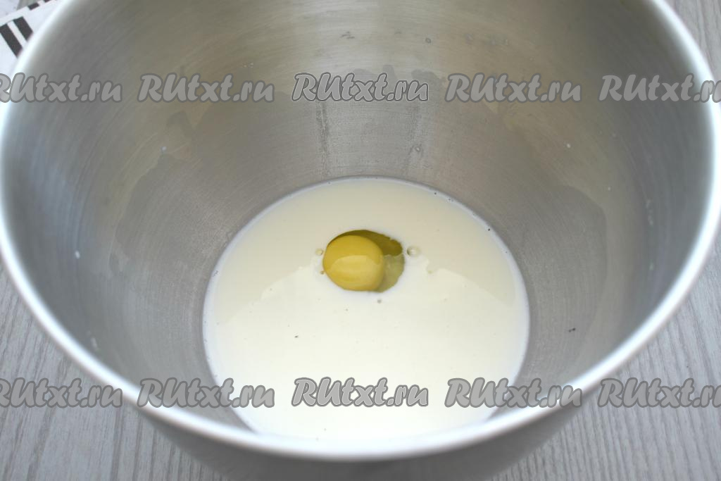 Перед замешиванием теста кислое молоко нужно прогреть в ковшике при постоянном перемешивании до комнатной температуры. Вливаем в глубокую миску кислое молоко комнатной температуры, добавляем сырое яйцо, всыпаем соль.