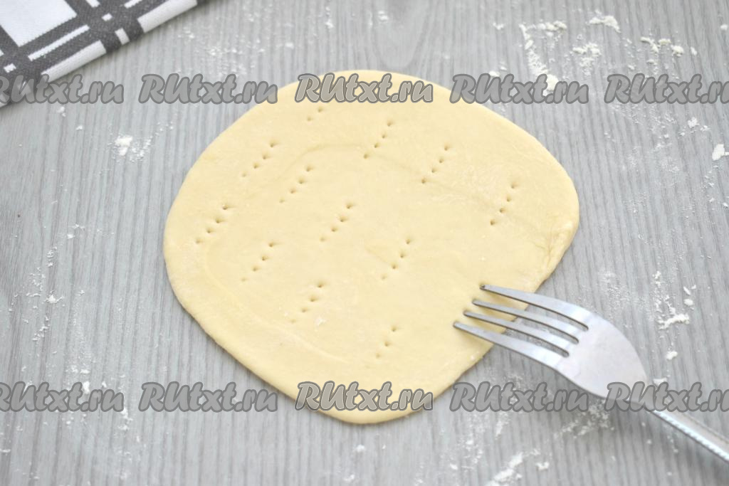 Каждый кусочек теста на присыпанной мукой поверхности раскатываем в лепёшку толщиной примерно 3 миллиметра. В результате у меня получились 6 заготовок лепёшек диаметром 15 сантиметров. На поверхности лепёшек делаем достаточно частые проколы вилкой. Благодаря проколам, тесто не будет сильно вздуваться в процессе жарки на сковороде.