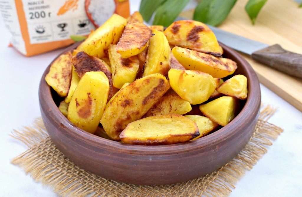 Ароматный, вкусный картофель, запечённый по-деревенски, достаём из духовки и горячим подаём к столу в качестве основного блюда, дополнив любимыми соусами, или в качестве гарнира к мясу, птице. Благодаря крахмалу, картошка покрывается хрустящей корочкой и становится очень аппетитной.
