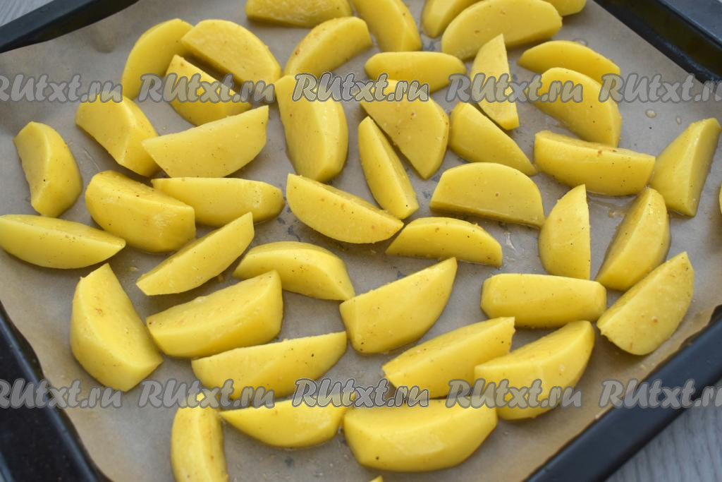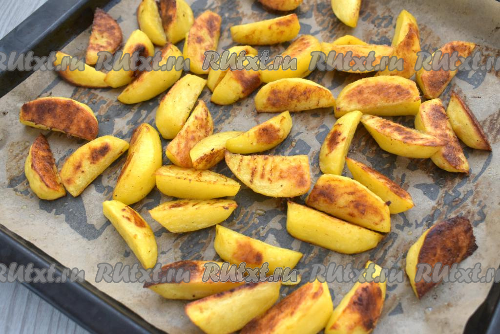 Запекаем картофель по-деревенски в крахмале минут 15-20, затем перемешиваем и запекаем ещё 20-25 минут (до готовности). Готовые дольки картошки должны легко прокалываться ножом. Продолжительность запекания во много зависит от сорта картофеля и величины нарезки.