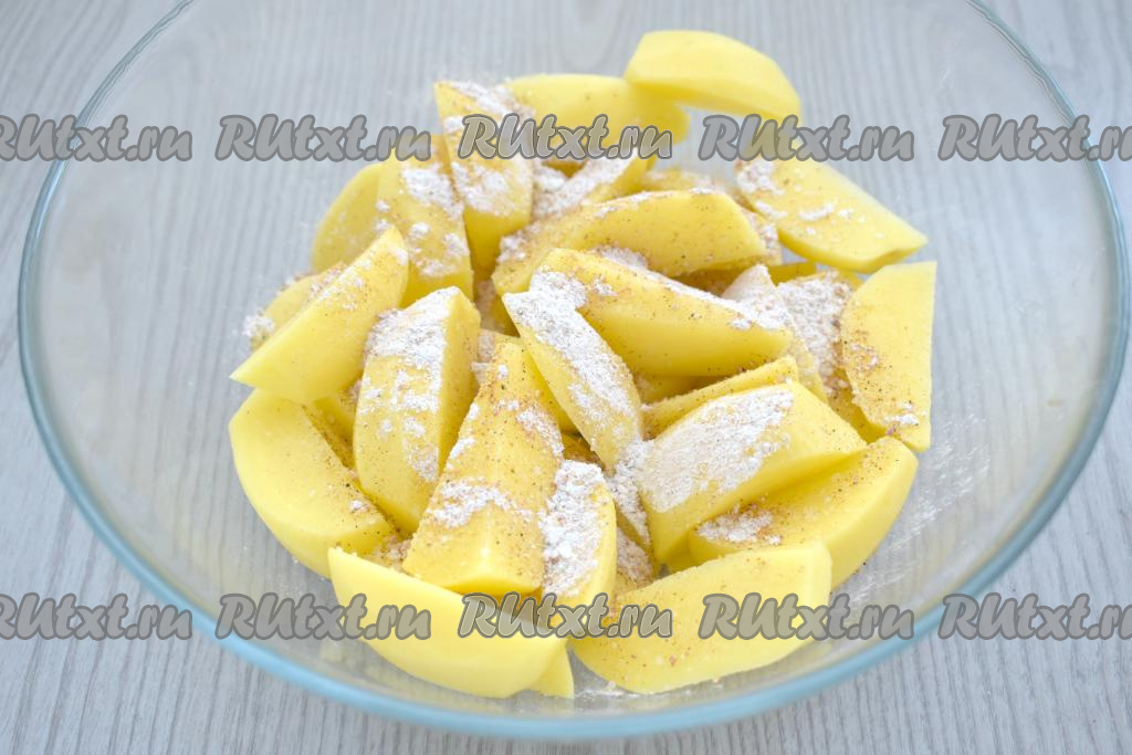 Получившуюся смесь всыпаем к ломтикам картошки, хорошо перемешиваем, покрывая картофель крахмалом и специями со всех сторон.