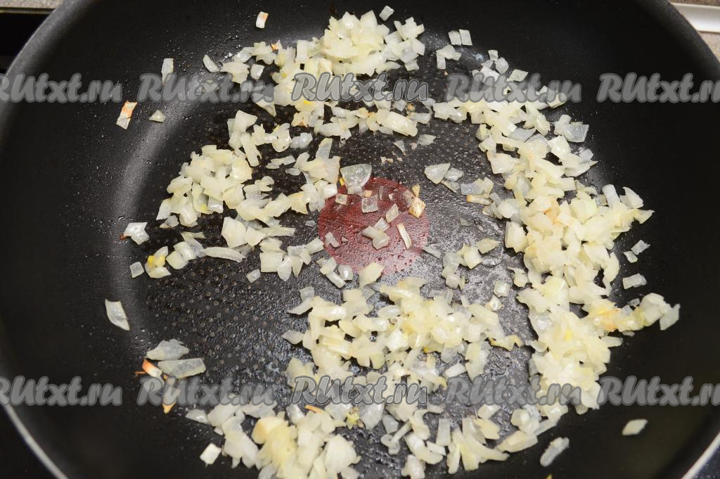 Прежде всего займёмся начинкой для пирога, для этого очищенный лук нужно мелко нарезать, выложить в сковородку, в которой уже разогрелось растительное масло. Обжарить лук на среднем огне до мягкости (ориентировочно в течение 3-4 минут), периодически помешивая. Убрать лук с огня, дать ему немного остыть.