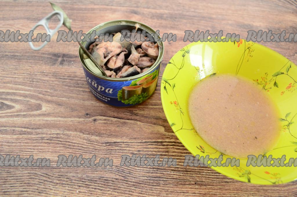 Открыть банку с консервированной сайрой, лишнюю жидкость слить.