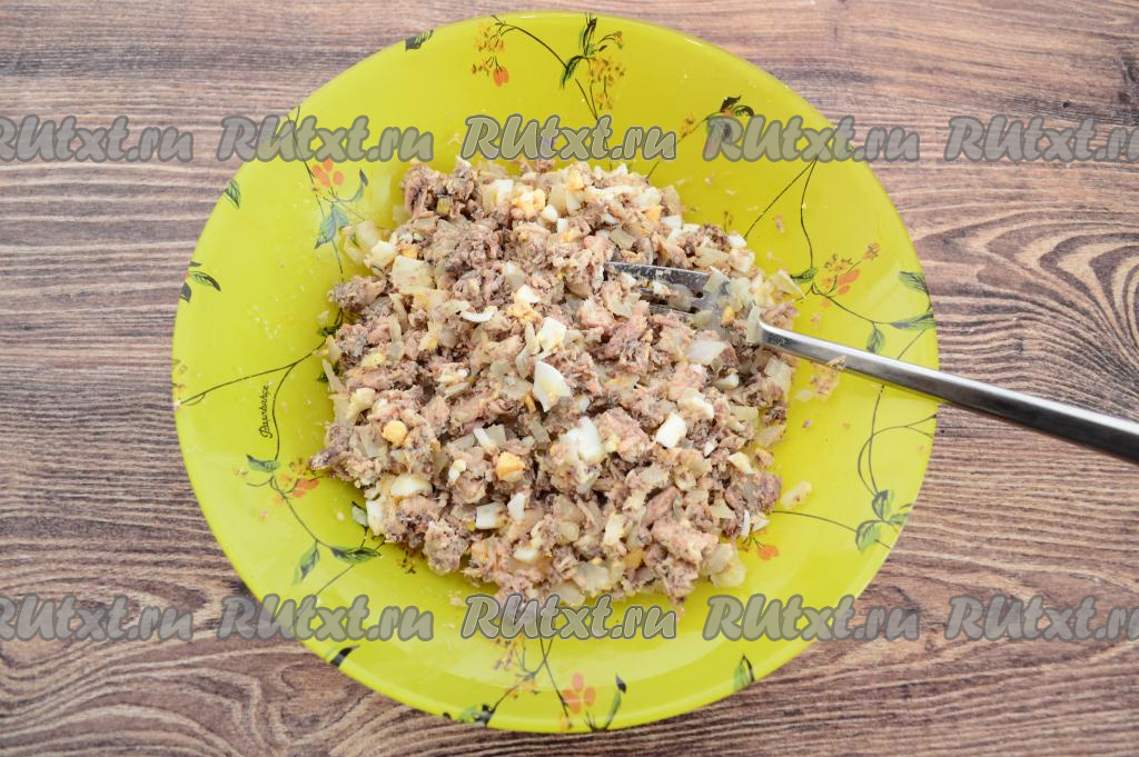 Перемешать сайру с луком и яйцом до однородности и наша начинка для пирога готова.