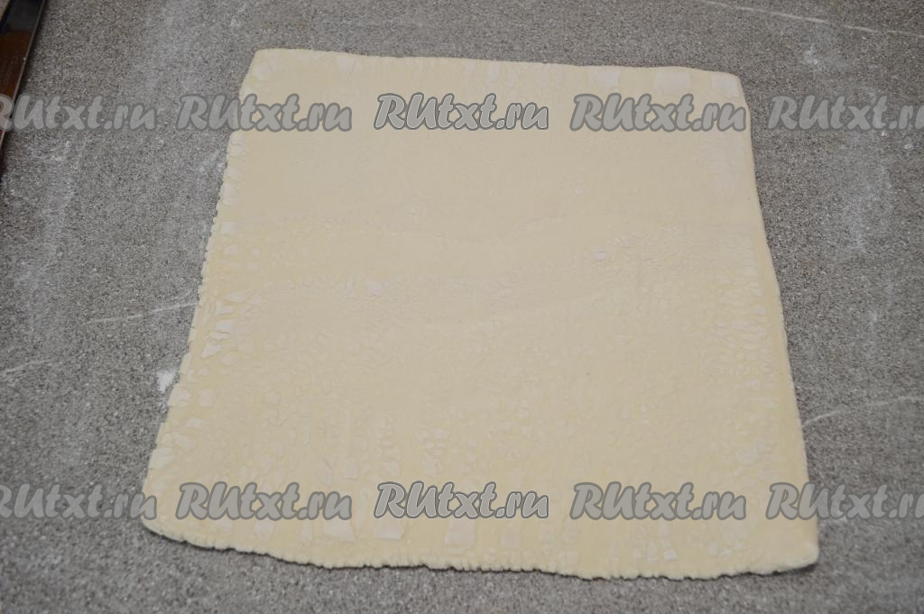 Пласт размороженного слоёного теста на присыпанной мукой поверхности раскатать скалкой в квадрат со стороной 25 сантиметров и толщиной примерно 2,5-3 миллиметра.