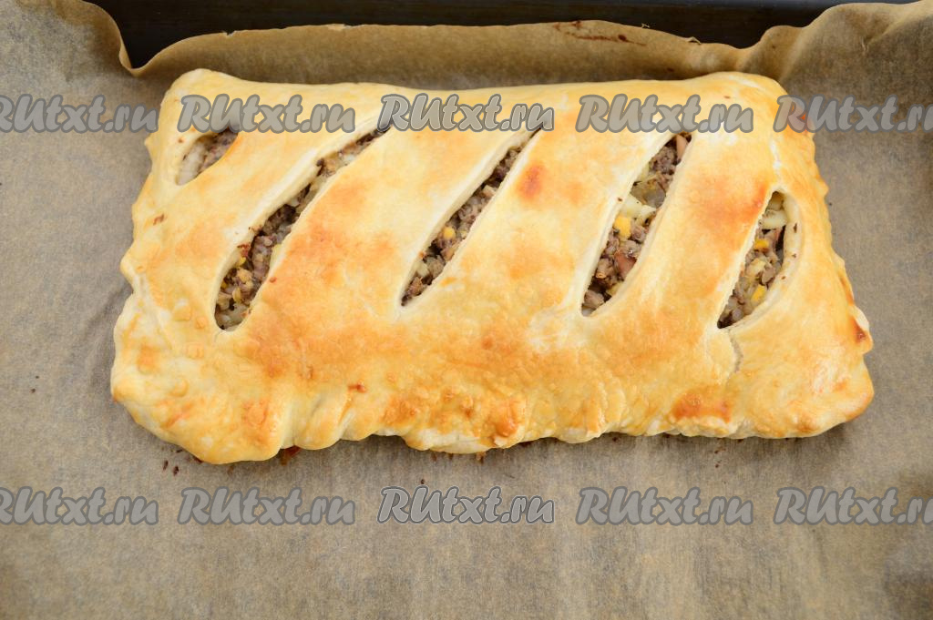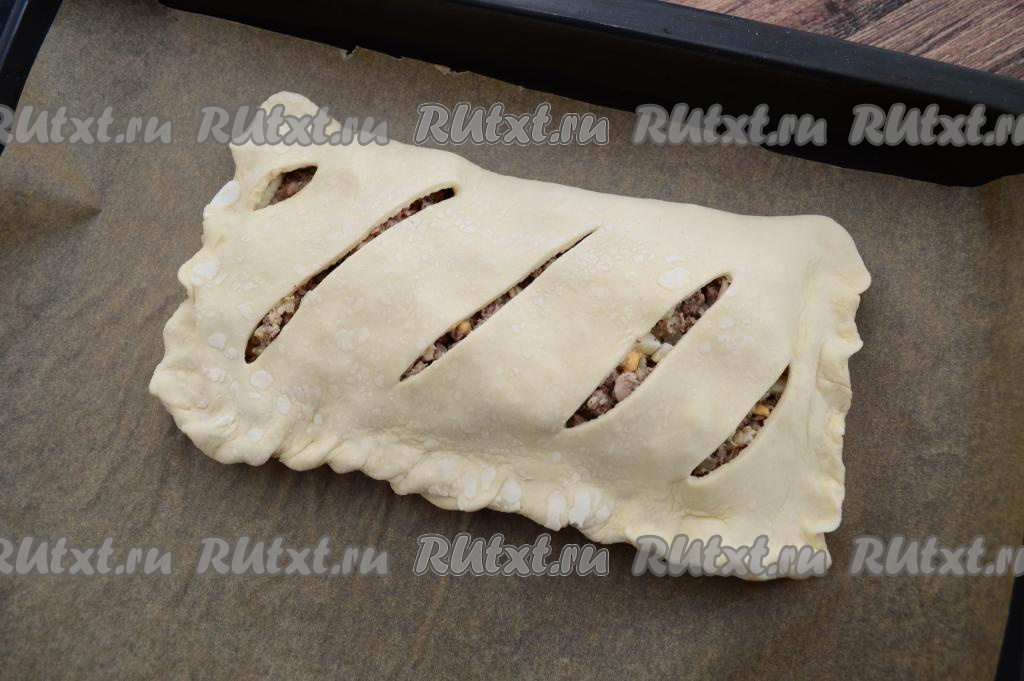 Накрыть начинку стороной с надрезами, хорошо скрепить края теста, сформировав прямоугольный пирог.