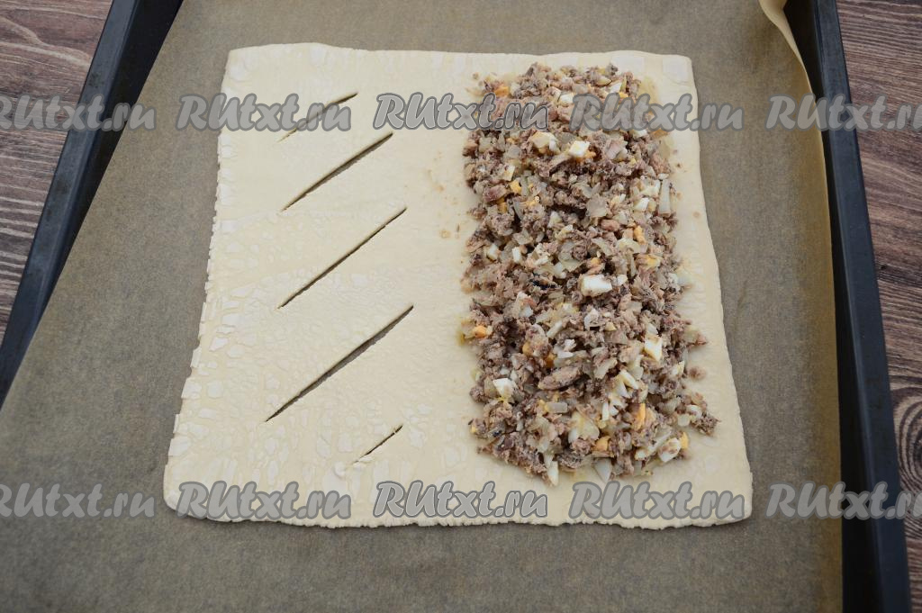 Перенести раскатанный пласт теста на противень, застеленный бумагой для выпечки. На сторону теста без надрезов, отступив от краёв теста примерно по 1,5 сантиметра, равномерно выложить начинку.