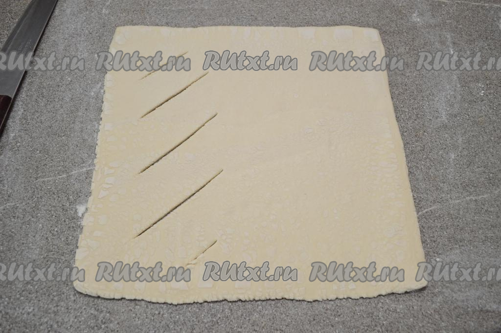С одной стороны квадрата сделать надрезы, отступая от краёв теста 1-1,5 сантиметра.