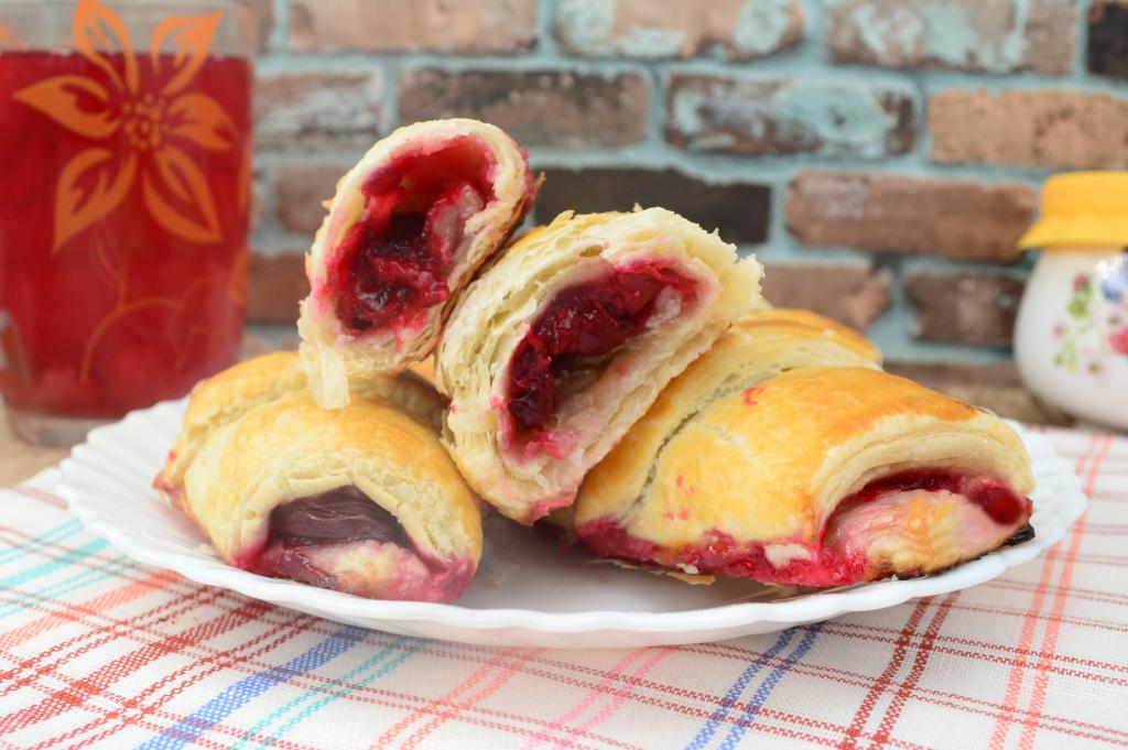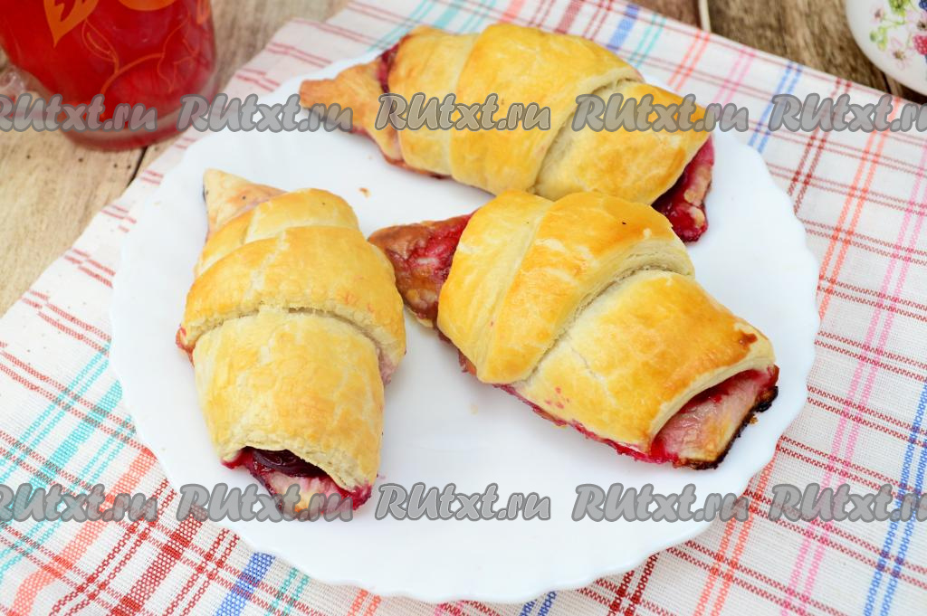 Достать противень с готовой выпечкой из духовки, дать немного остыть. Круассаны с вишней можно подавать к столу и тёплыми, и полностью остывшими.
