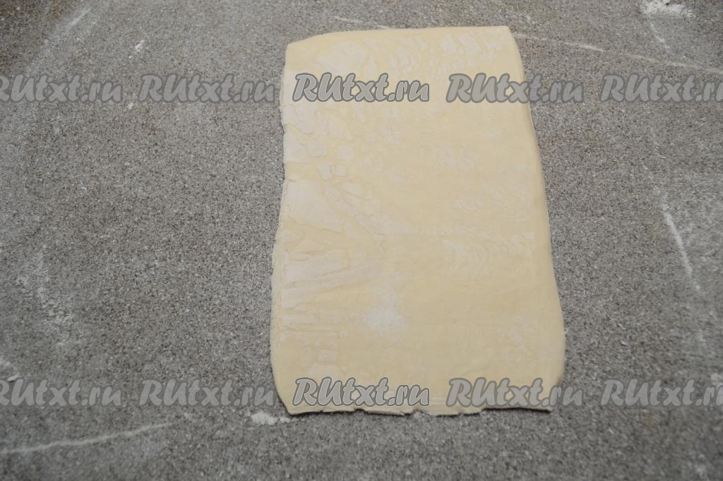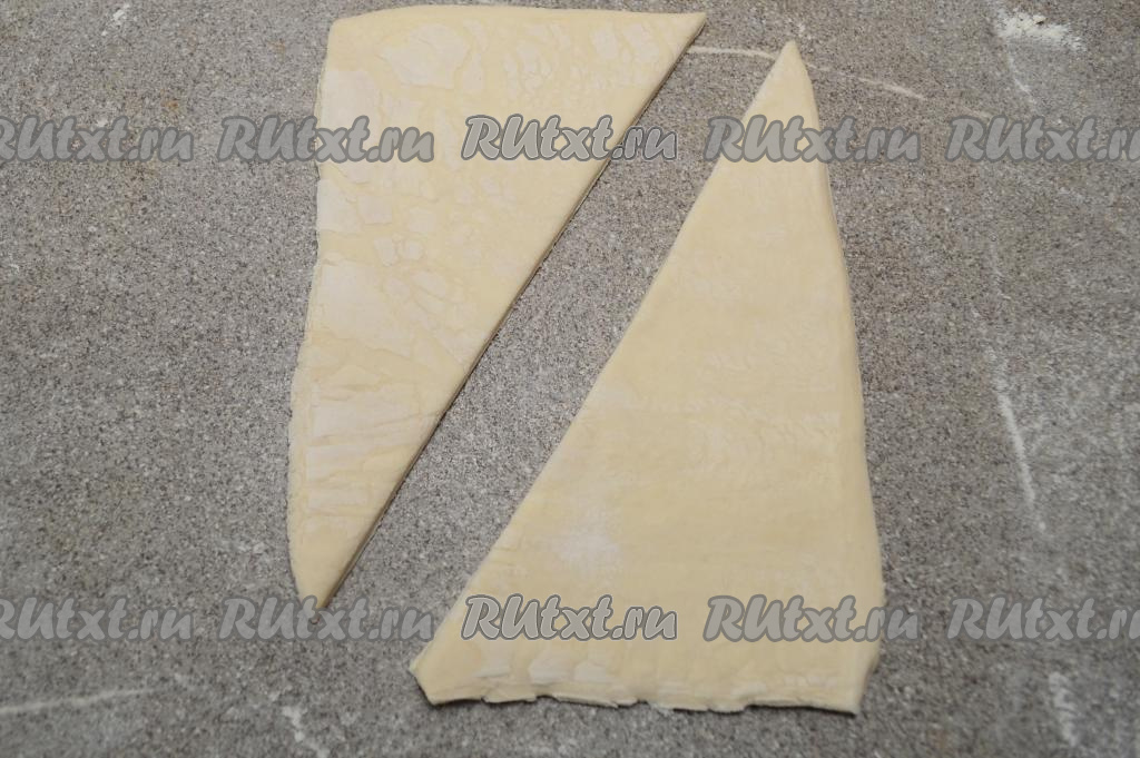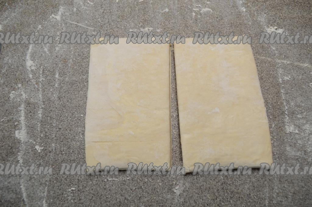 Разморозившийся пласт слоёного теста на присыпанном мукой столе разрезать ножом на 2 прямоугольника.