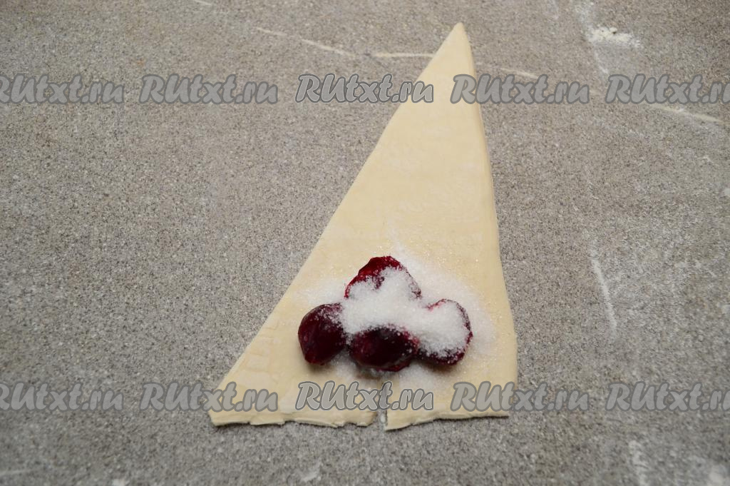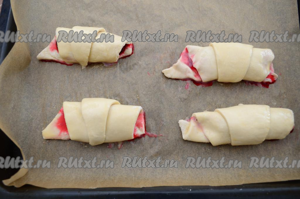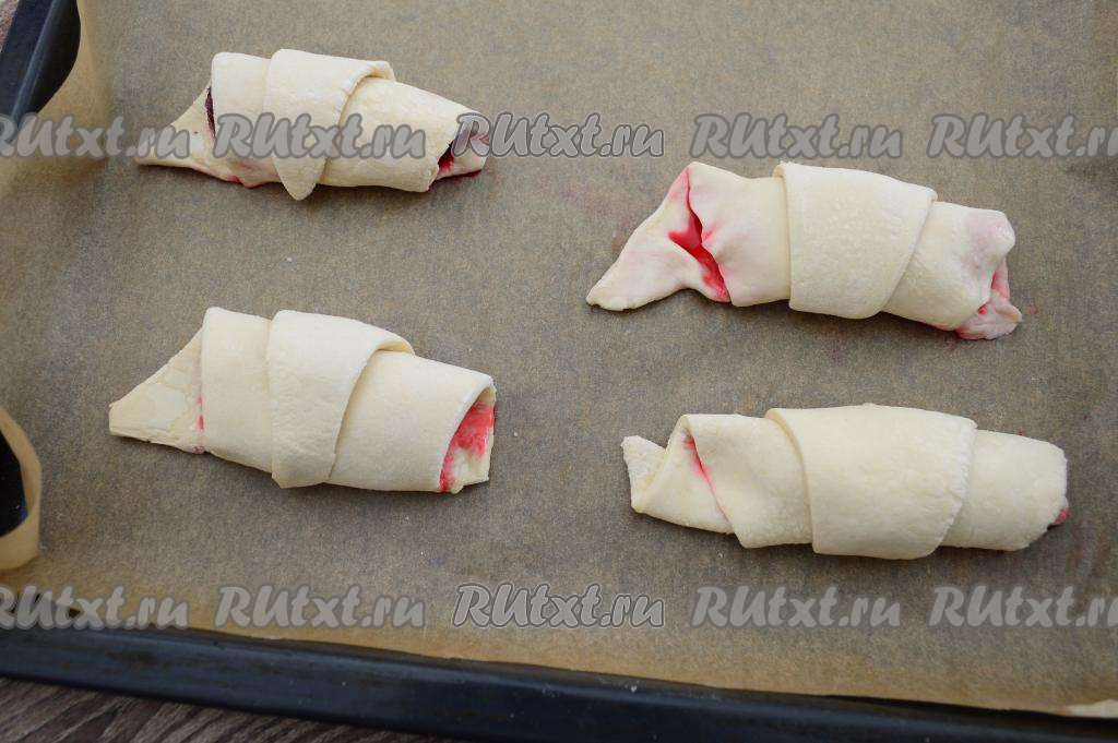 В результате у меня получились 4 заготовки круассанов с вишней, выложить их на противень, застеленный бумагой для выпечки.