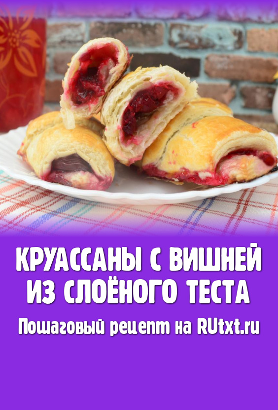 Вилкой взбить сырое яйцо в небольшой ёмкости. При помощи кулинарной кисти смазать поверхность слоек взбитым яйцом. Отправить противень в духовку, разогретую до 200 градусов, выпекать круассаны с вишней минут 25 (до приятного подрумянивания слоёного теста).