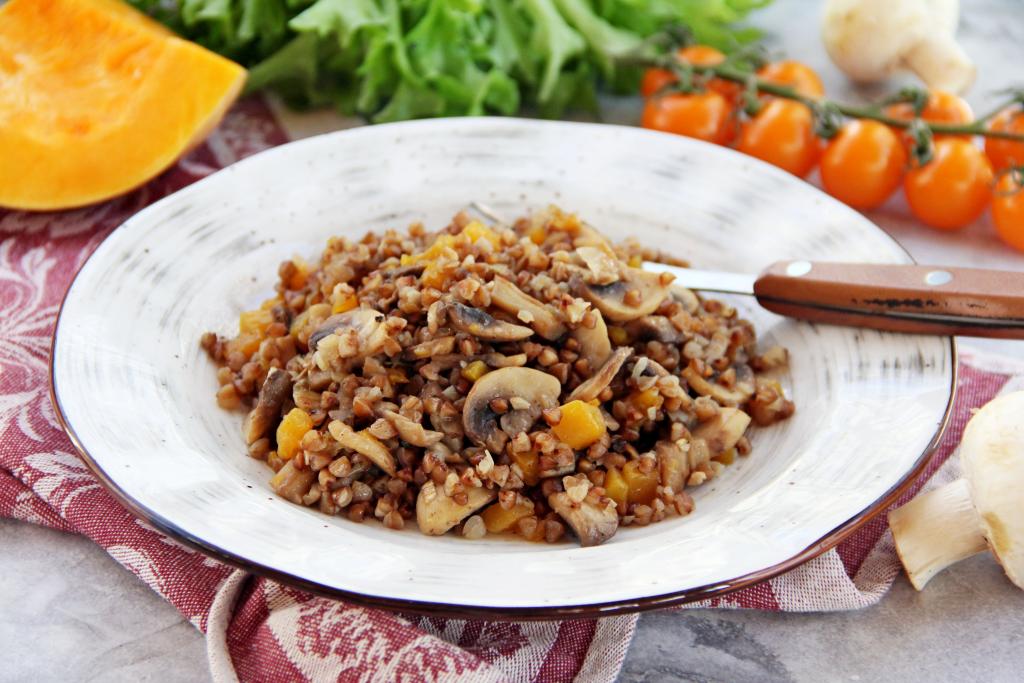 Разложить рассыпчатую гречку вместе с аппетитной тыквой и нежными грибами по тарелкам и подать к столу в горячем виде в качестве основного блюда или в качестве гарнира к птице, мясу.