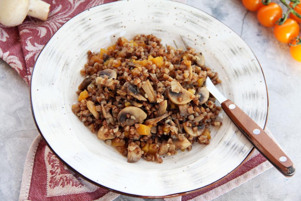 Предлагаю к обеду или ужину приготовить на сковороде гречку с тыквой и грибами. Это вкусное и сытное блюдо в дни Поста можно подать к столу в качестве основного. Ну а в остальные дни гречка с тыквой и грибами станет прекрасным гарниром к котлетам, сосискам, курице. Шампиньоны в этом блюде получаются нежнейшими, они отлично сочетаются с аппетитными кусочками тыквы. Гречка в процессе томления становится рассыпчатой и ароматной. Всем советую попробовать это блюдо!