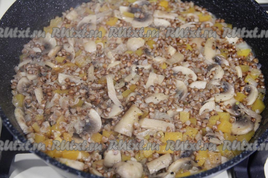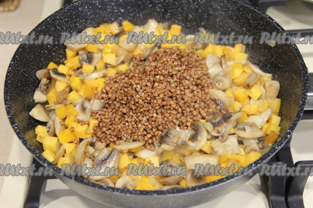 Обжарить тыкву с грибами 5 минут, периодически помешивая. Выложить подготовленную гречку.