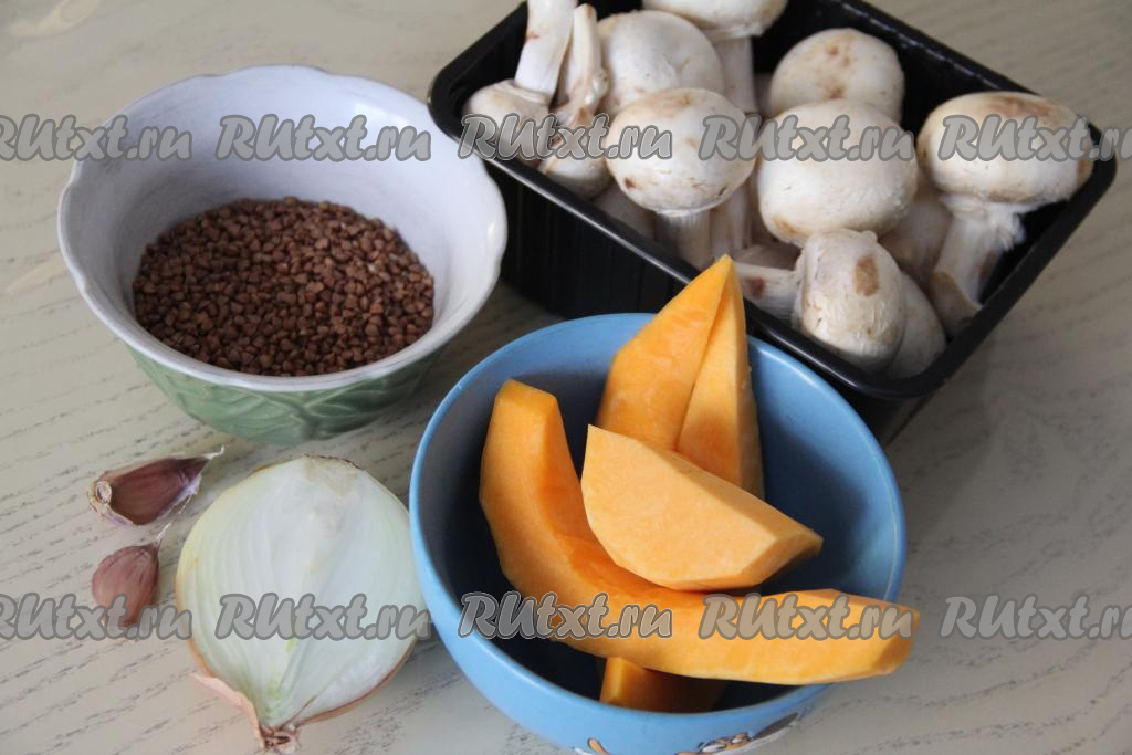 Подготовить продукты. Шампиньоны промыть водой. Для этого блюда нам потребуется 250 грамм тыквы, очищенной от волокон и кожуры с семечками. Лук и чеснок почистить. Гречку, если необходимо, перебрать. Выложить гречку в сито, промыть проточной водой, дать лишней воде стечь. промыть.