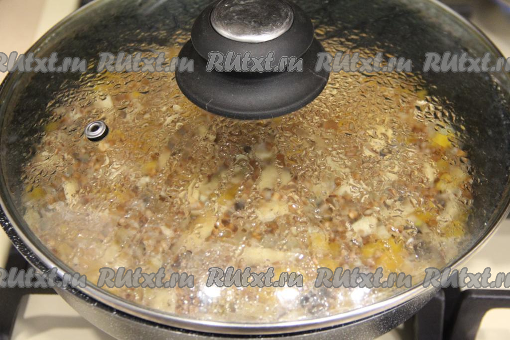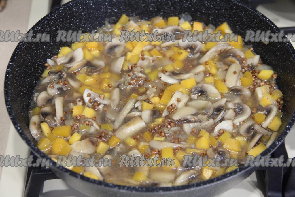 Накрыть сковороду крышкой и готовить гречку с тыквой и грибами на медленном огне до полного испарения воды (минут 20-25, гречка должна стать мягкой, но не переваренной).