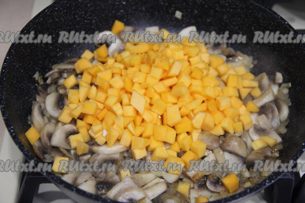 Затем добавить тыкву, нарезанную на мелкие кубики, перемешать.